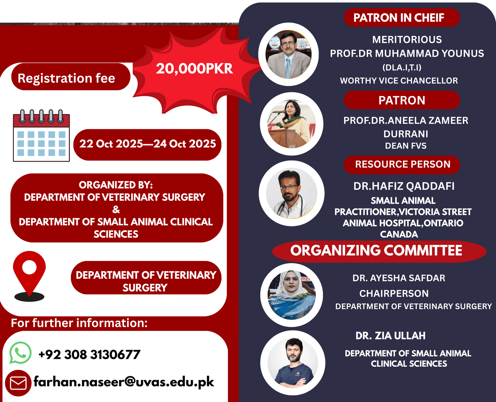 Department of Veterinary Surgery in collaboration with Department of Small Animal Clinical Sciences UVAS Lahore, is going to organize A 3 Day International Hands-on Training Workshop in Small Animal Dentistry, Anesthesia, and Soft Tissue Surgery. This workshop will be held in the Department of Veterinary Surgery from 22 Oct 2025 to 24 Oct 2025, and will be featured by International Trainer.