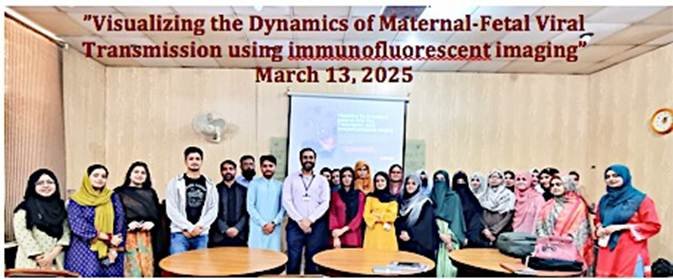 VC approved One-day seminar organized on ”Visualizing the Dynamics of Maternal-Fetal Viral Transmission using immunofluorescent imaging” at Department of Pathology, UVAS by Dr. Muhammad Suleman, on March 13 2025. The seminar was attended by faculty and postgraduate students showing great enthusiasm for the new technology for studying viral transmission.