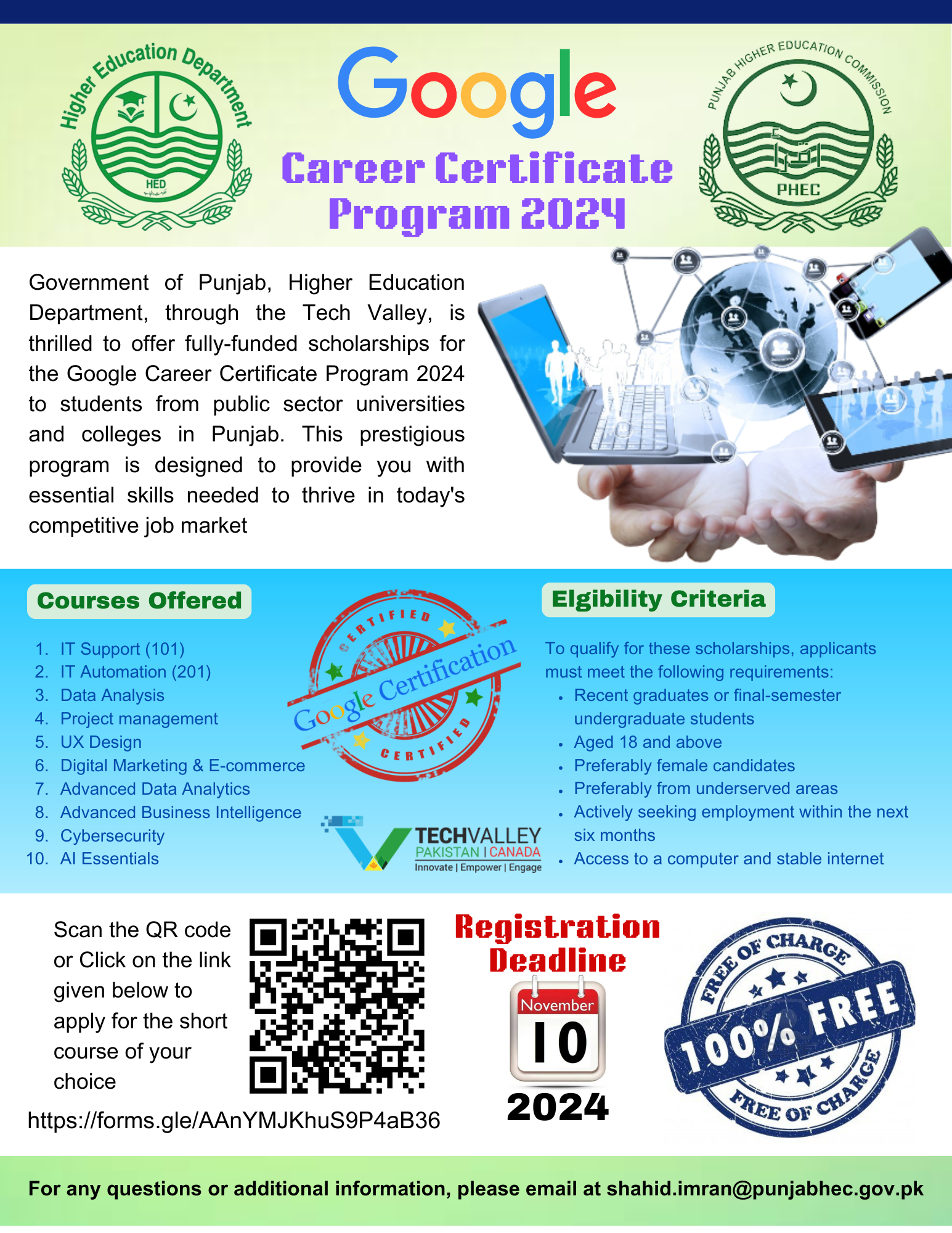 Govt. of Punjab, Higher Education Department & PHEC through the Tech Valley—an official partner of Google for Education in Pakistan is offering scholarships for the Google Career Certificate Program 2024 (online). The program is being implemented through the Punjab Higher Education Commission (PHEC) and the Higher Education Department. Google will award certificates to the students who will successfully complete the online courses. This program includes ten short certificate courses: