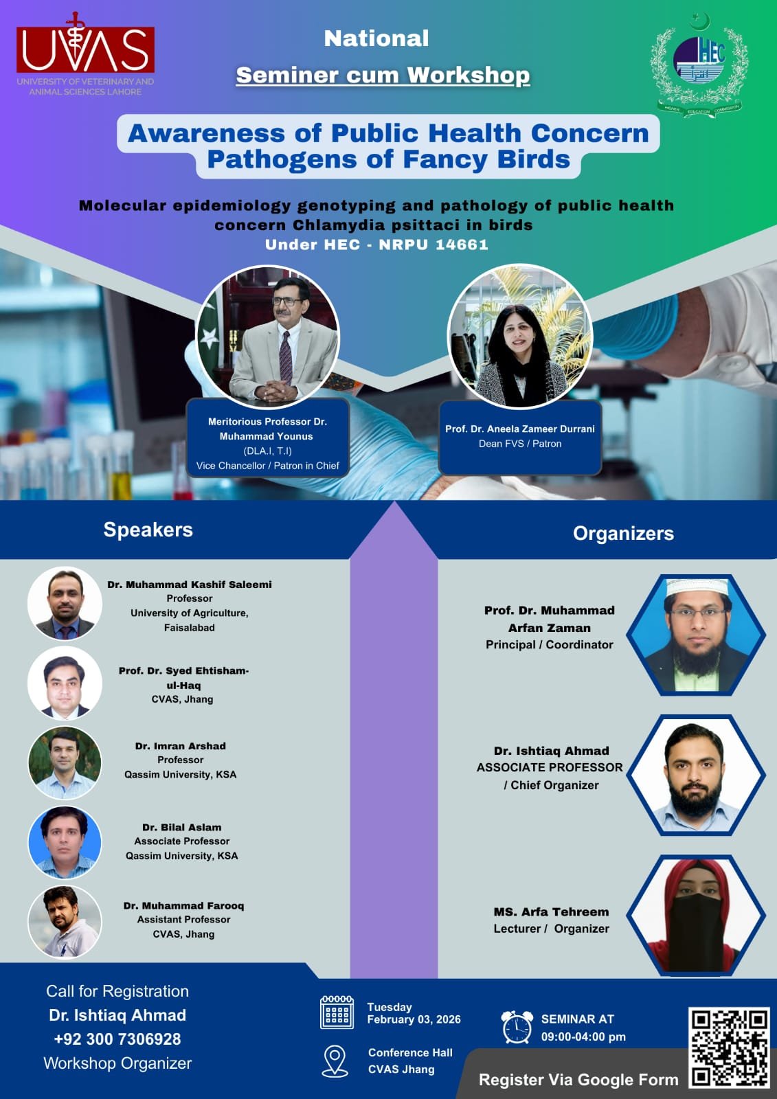 The Seminar cum Workshop on the Awareness of Public Health Concern Pathogens of Fancy Birds, organized under the HEC-NRPU Project #14661, will be held on 3rd February 2026 at CVAS, Jhang. This one-day academic and practical event is designed to enhance awareness and technical competence regarding zoonotic and public health–significant pathogens of fancy birds, with particular emphasis on Chlamydia psittaci and other emerging avian pathogens. The program integrates expert lectures, One Health perspectives, and hands-on laboratory training, covering current disease status, public health implications, diagnostic approaches, and molecular epidemiology. Through interactive technical sessions and practical demonstrations on nucleic acid extraction and PCR-based molecular detection, the workshop aims to bridge the gap between theoretical knowledge and applied diagnostics, benefiting students, researchers, veterinarians, and other stakeholders involved in avian health and zoonosis prevention. Learning ObjectivesBy the end of this seminar cum workshop, participants will be able to: